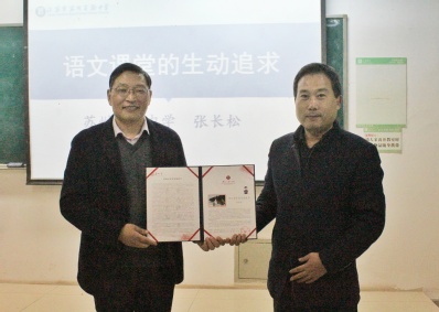 在讲座正式开始之前,黄色网 副院长周生杰教授代表学院和学生对张长松老师的到来表示了热烈的欢迎,为张长松老师颁发了“东吴语文教学讲坛”纪念证书并合影留念。