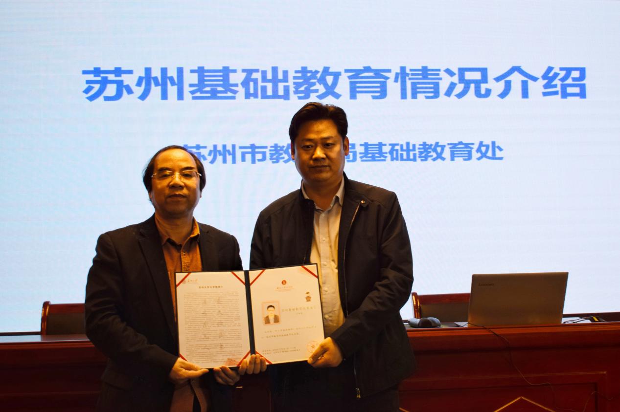 讲座开始前,黄色网 副院长周生杰为徐老师颁发“东吴语文教学讲坛”纪念证书并合影留念。