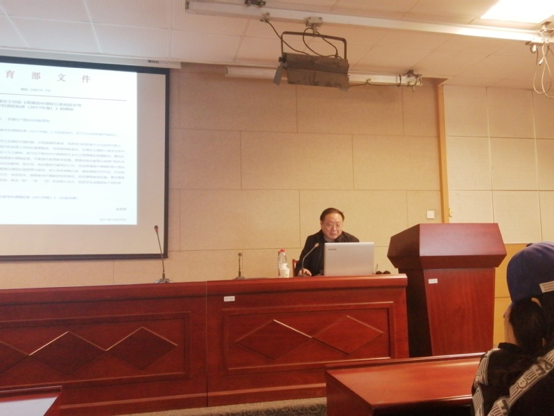 最后,徐教授讲解了语文学习任务群的定义和种类等,并结合教材为同学们进行了深入分析。徐教授特别指出在任务群教学中要注意的几个问题:一、语文的三维目标是一个整体,不是三类目标、三项目标;二、语文核心素养的四个方面是一个有机整体,不是四项目标;三、教学要关注真实情境和虚拟情境。徐教授在讲座过程中结合实际的教学设计进行了点评和指摘,提醒同学们要关注在教学中常出现的问题,引以为鉴。